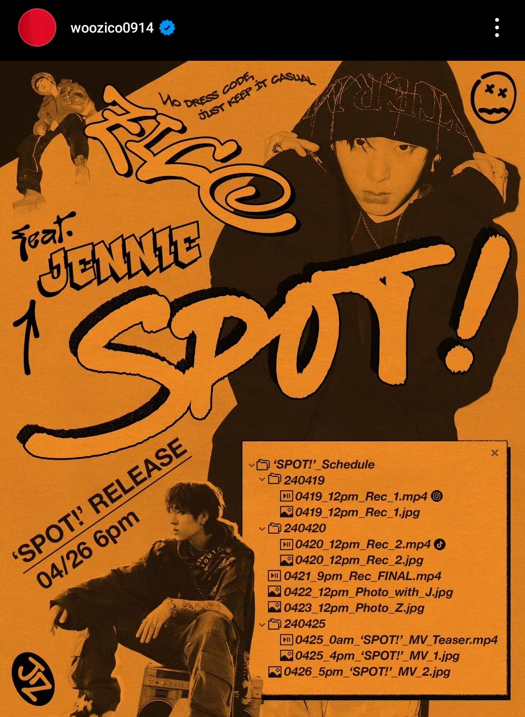 | April 26, 2024 at 6 PM KST | ZICO Title Track: ‘SPOT! (feat. JENNIE)’ Album: 11th Digital Single ‘SPOT! (feat. JENNIE)’ Music Video: YouTube |